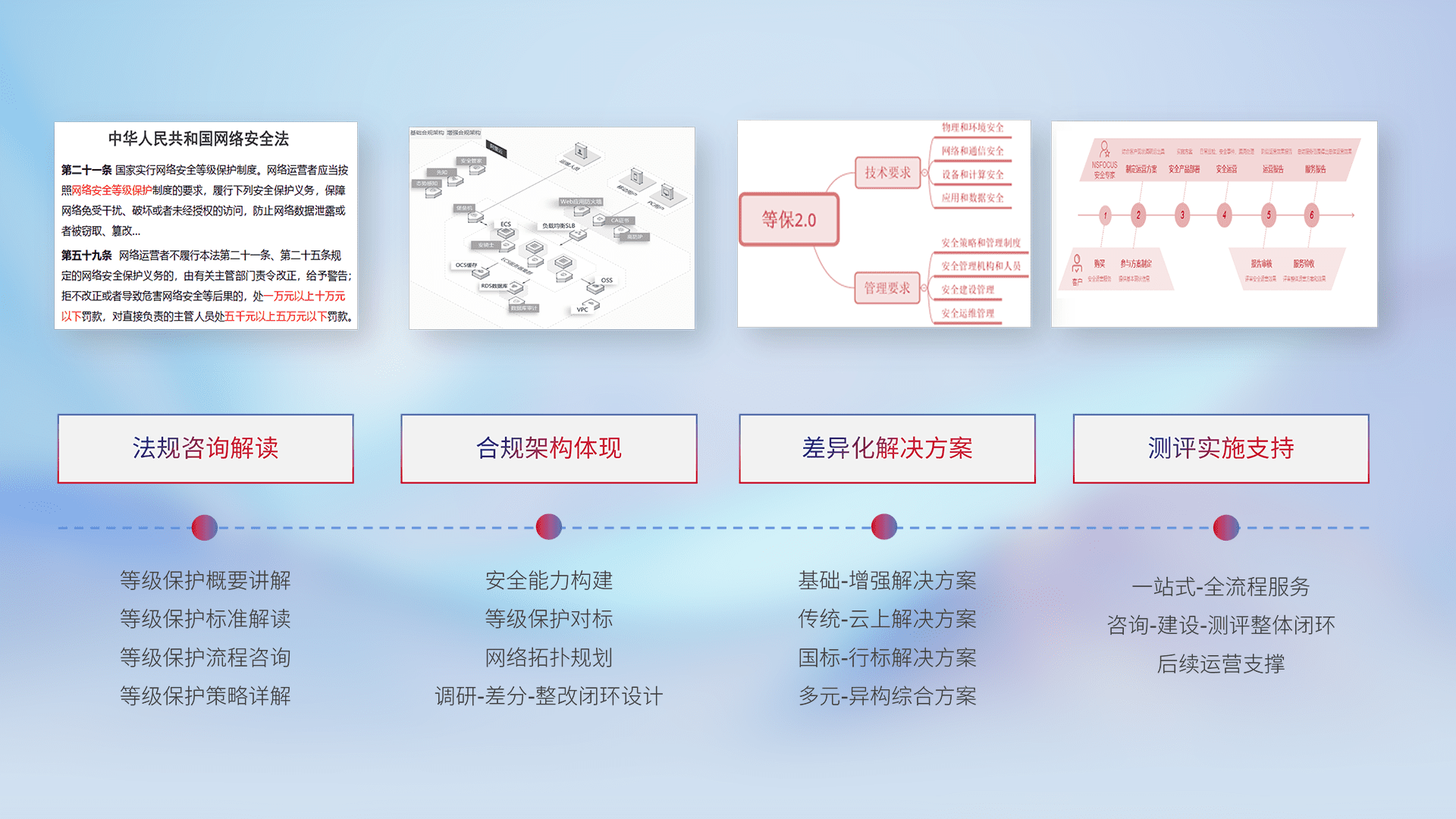 通过专业的法律咨询解读、、、合规架构体现、、、、差异化解决方案、、、、测试实施支持等服务,,,为客户量身打造等保合规体系。。。。